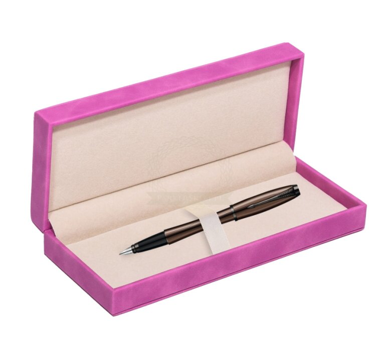 Elegancki metaliczny efekt matowego, brązowego wykończenia. Korpus metalowy w kolorze brązowym z asymetrycznym wzorem nałożonym na korpus pióra.