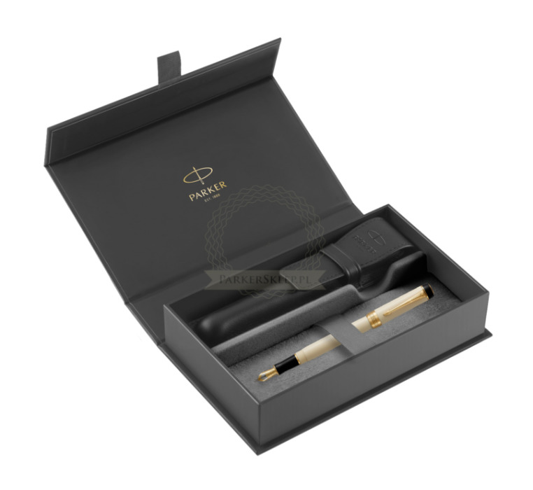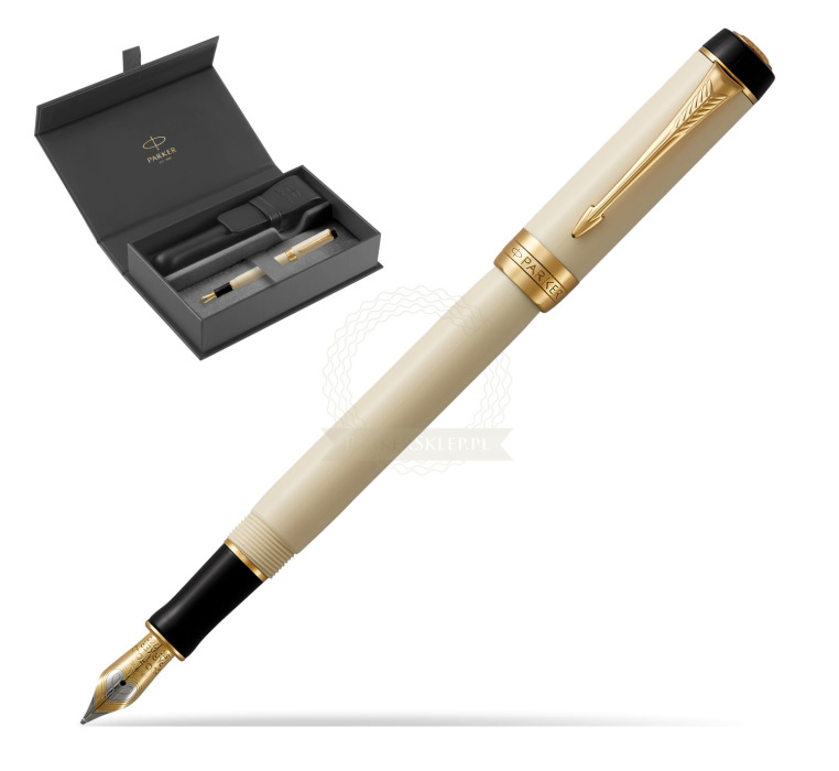 Gustowna kolekcja pióra wiecznego Duofold. Pióro wieczne wykończone jest mosiądzem platerowanym złotem. Charakterystycznymi elementami są potrójny pierścień wieńczący skuwkę pióra z oznaczeniem marki Parker oraz oznaczenie kraju wykonania - Made in France na łączniku sekcji. Korpus i nasadka pokryte wysokiej jakości żywicą akrylową w subtelnym kolorze kości słoniowej. Miedziane pierścienie platerowane złotem. Korona i klip to mosiądz platerowany złotem. Wszystkie platerowania wykonane są 23 – karatowym złotem. Dwukolorowa stalówka z 18-karatowego złota, delikatnie wykończona rodem. W luksusowym opakowaniu prezentowym Parker. Duofold to jedyna kolekcja piór Parker z odkręcaną nasadką. Do pióra pasują naboje atramentowe Parker. Idealne pióro wieczne Parker na prezent dla kobiety. Trafny upominek Parker na wszelkiego rodzaju uroczystości i jubileusze. Sprawdź dostępność telefonicznie!! UWAGA: Wkład do pióra umieszczony jest pod spodem dna pudełka