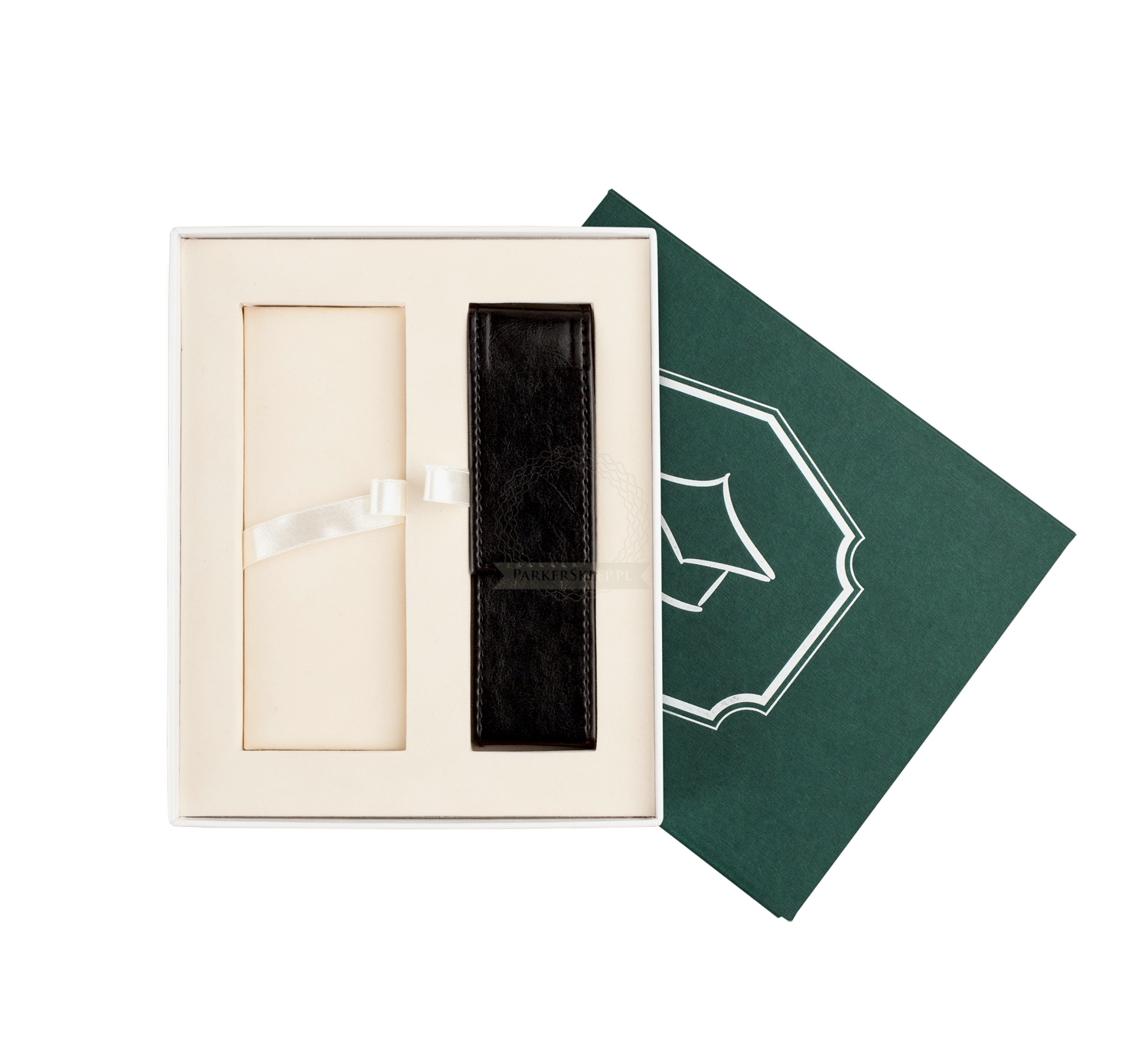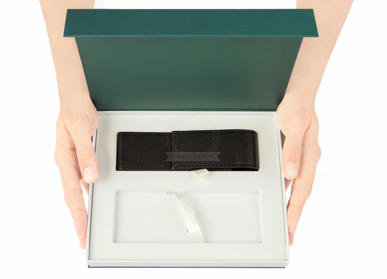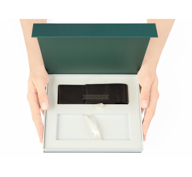 Proponujemy Państwu eleganckie pudełko prezentowe "hand made" w kolorze ciemnej zieleni, przeznaczone na dwa produkty Parker. Powierzchnia pudełka powleczono specjalnym zielonym płótnem. Tłoczone białym wzorkiem na powierzchni. Pudełko zawiera stylowe etui wykonane z czarnej ekoskóry. Wyściełane atłasem, posiada eleganckie, prezentowe tasiemki. Zamykane na magnes.
