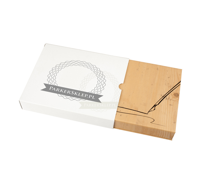 Proponujemy Państwu eleganckie pudełko prezentowe "hand made" o "drewnianej" fakturze powierzchni, przeznaczone na dwa produkty Parker. Powierzchnia pudełka powleczono specjalnym płótnem.Tłoczone wzorkiem na powierzchni. Pudełko zawiera stylowe etui wykonane z czarnej ekoskóry. Wyściełane atłasem, posiada eleganckie, prezentowe tasiemki. Zamykane na magnes.
