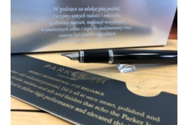 Pióro odznaczające się ponadczasową dyskretną elegancją. Każdy detal linii zaprojektowany został tak, by zapewnić niezawodność pisania. Na mosiężnej bazie położono kilkanaście warstw czarnego lakieru. Pierścienie chromowane i polerowane. Część przednia wykonana z połyskującego, czarnego tworzywa sztucznego. Pióro wieczne wyposażone jest w stalówkę z wysokiej jakości stali nierdzewnej. W piórze można korzystać z nabojów lub z tłoczka napełnianego atramentem (tłoczek nie dołączony). Idealne pióro wieczne Parker na prezent. Pióro wieczne Parker idealne również dla entuzjastów marki Parker i kolekcjonerów. UWAGA: Wkład do pióra jest pod spodem dna pudełka.