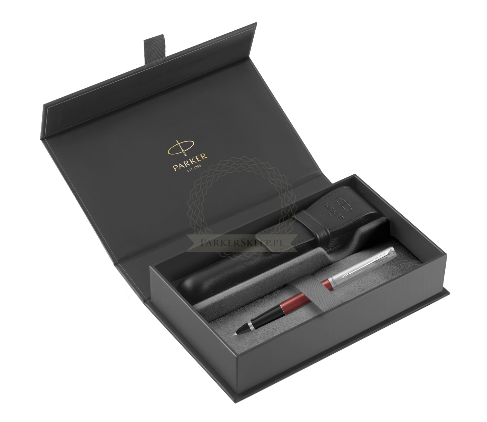 Zapakowany w pudełko upominkowe Parker. To pióro kulkowe jest dostarczane z jednym wkładem w losowym kolorze niebieskim lub czarnym.