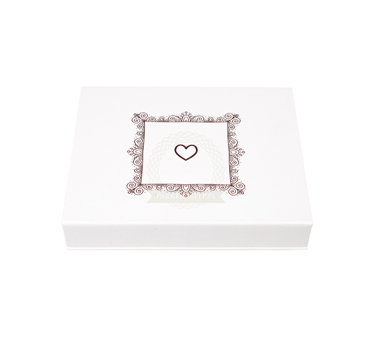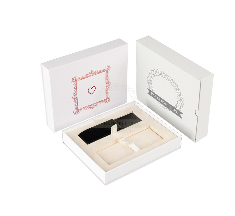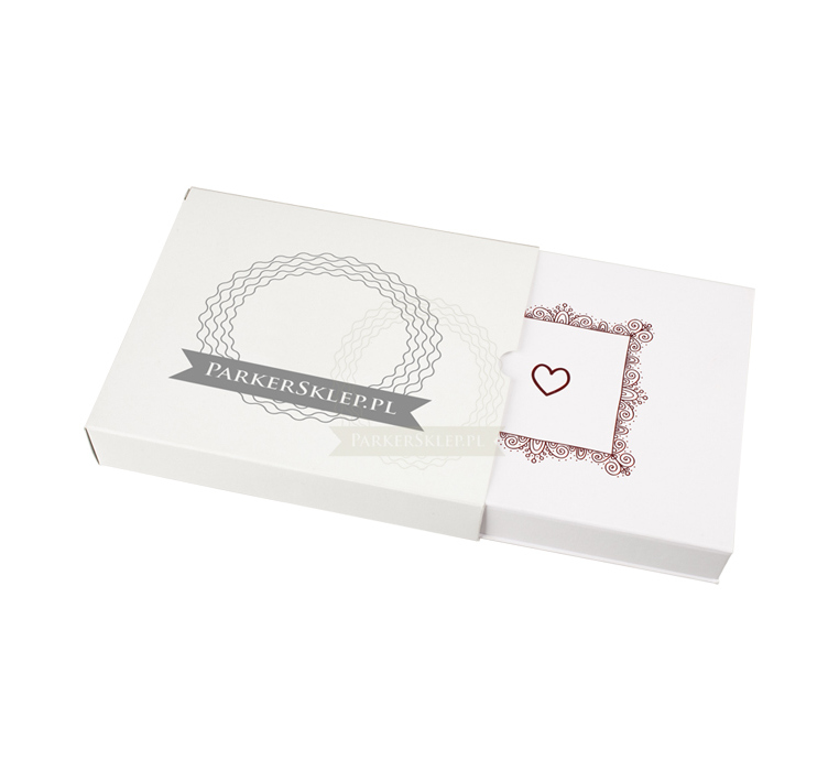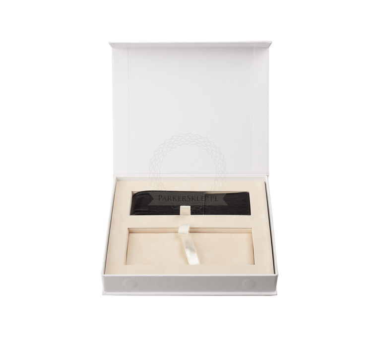 Proponujemy Państwu eleganckie pudełko prezentowe "hand made" w kolorze bieli, przeznaczone na dwa produkty Parker. Powierzchnia pudełka powleczono specjalnym płótnem. Tłoczone wzorkiem na powierzchni. Pudełko zawiera stylowe etui wykonane z czarnej ekoskóry. Wyściełane atłasem, posiada eleganckie, prezentowe tasiemki. Zamykane na magnes.