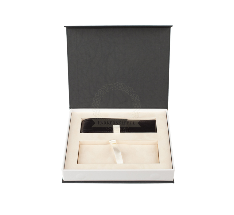 Proponujemy Państwu eleganckie pudełko prezentowe "hand made" w kolorze złotej zieleni, przeznaczone na dwa produkty Parker. Powierzchnia pudełka powleczono specjalnym płótnem. Tłoczone wzorkiem na powierzchni. Pudełko zawiera stylowe etui wykonane z czarnej ekoskóry. Wyściełane atłasem, posiada eleganckie, prezentowe tasiemki. Zamykane na magnes.
