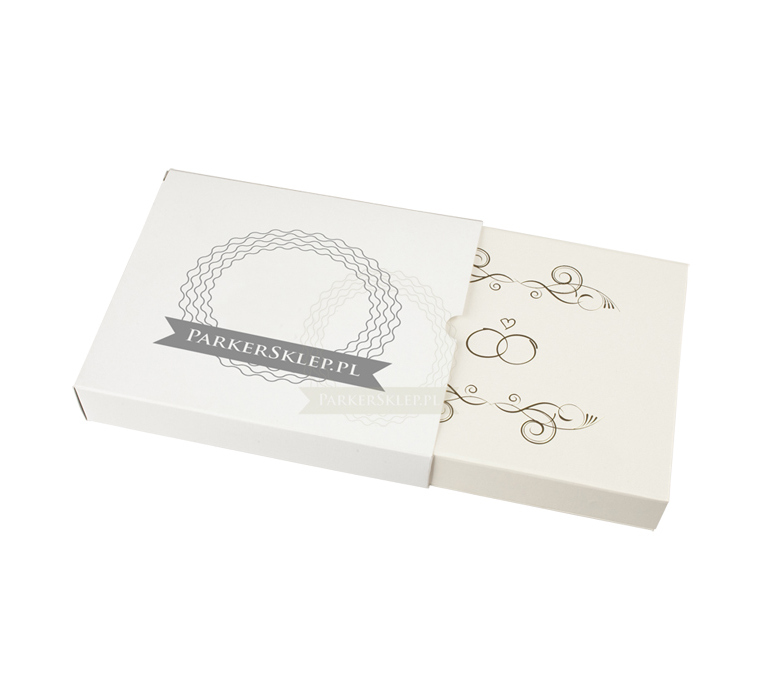 Proponujemy Państwu eleganckie pudełko prezentowe "hand made" w kolorze ecru, przeznaczone na dwa produkty Parker. Tłoczone wzorkiem na powierzchni Pudełko zawiera stylowe etui wykonane z czarnej ekoskóry. Wyściełane atłasem, posiada eleganckie, prezentowe tasiemki. Zamykane na magnes.
