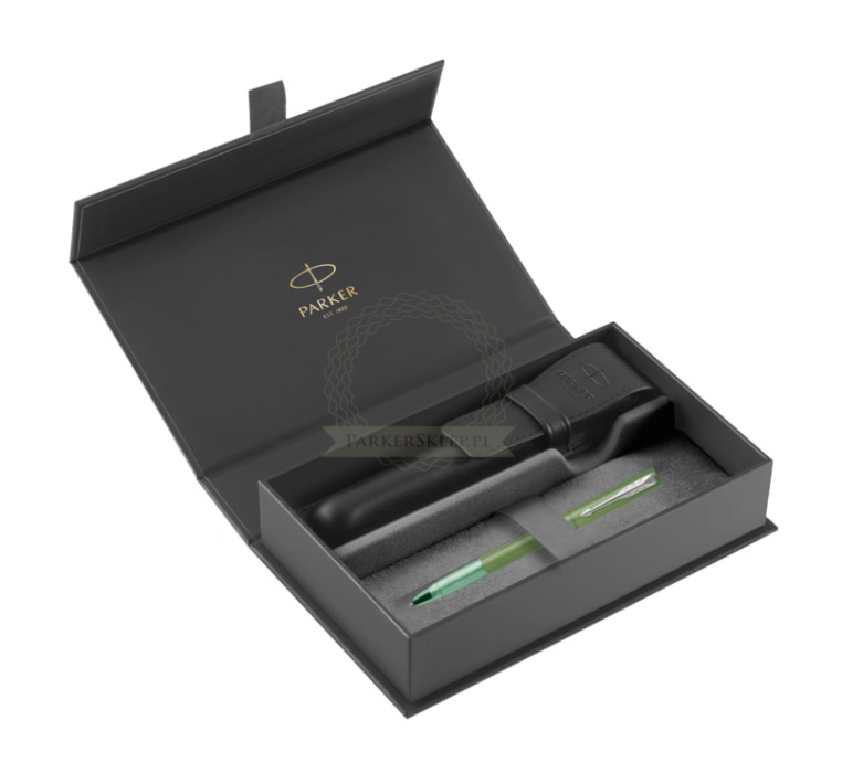 Metaliczne wykończenie w satynowym kolorze zieleni uzupełnione chromowanymi wykończeniami i charakterystycznym klipsem w kształcie strzałki PARKER.