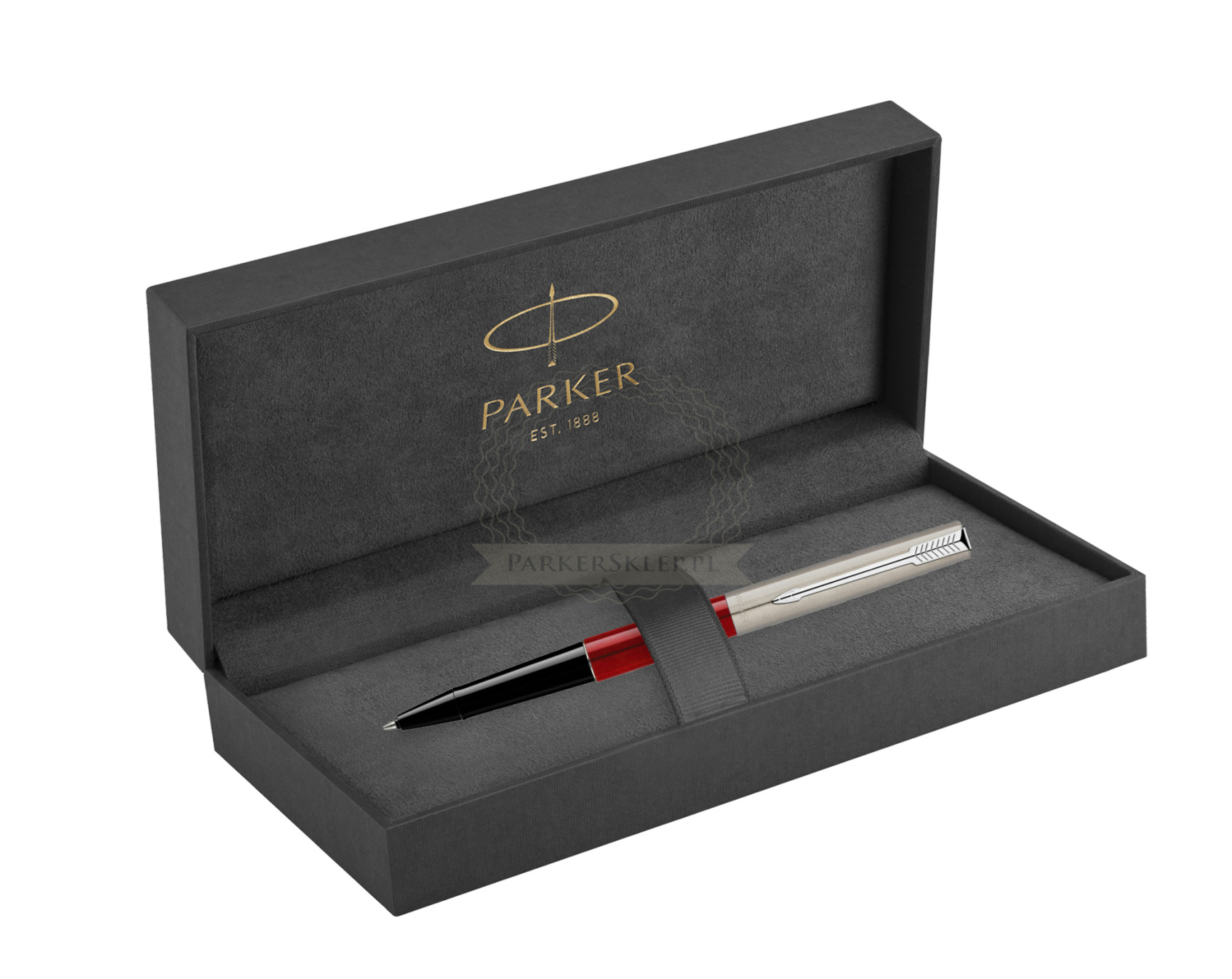 Pióro kulkowe Parker o klasycznym designie. Korpus w intensywnym czerwonym kolorze połączony został ze stalową skuwką i charakterystycznym klipsem w kształcie strzały. Solidne wykonanie i wygodny uchwyt zapewniają komfort pisania na co dzień. Korpus pióra wykonany z wysokiej jakości tworzywa sztucznego w kolorze czerwonym. Skuwka i klips ze stali nierdzewnej. Czarna plastikowa część przednia. Pióro kulkowe jest dostarczane z jednym wkładem w losowym kolorze niebieskim lub czarny