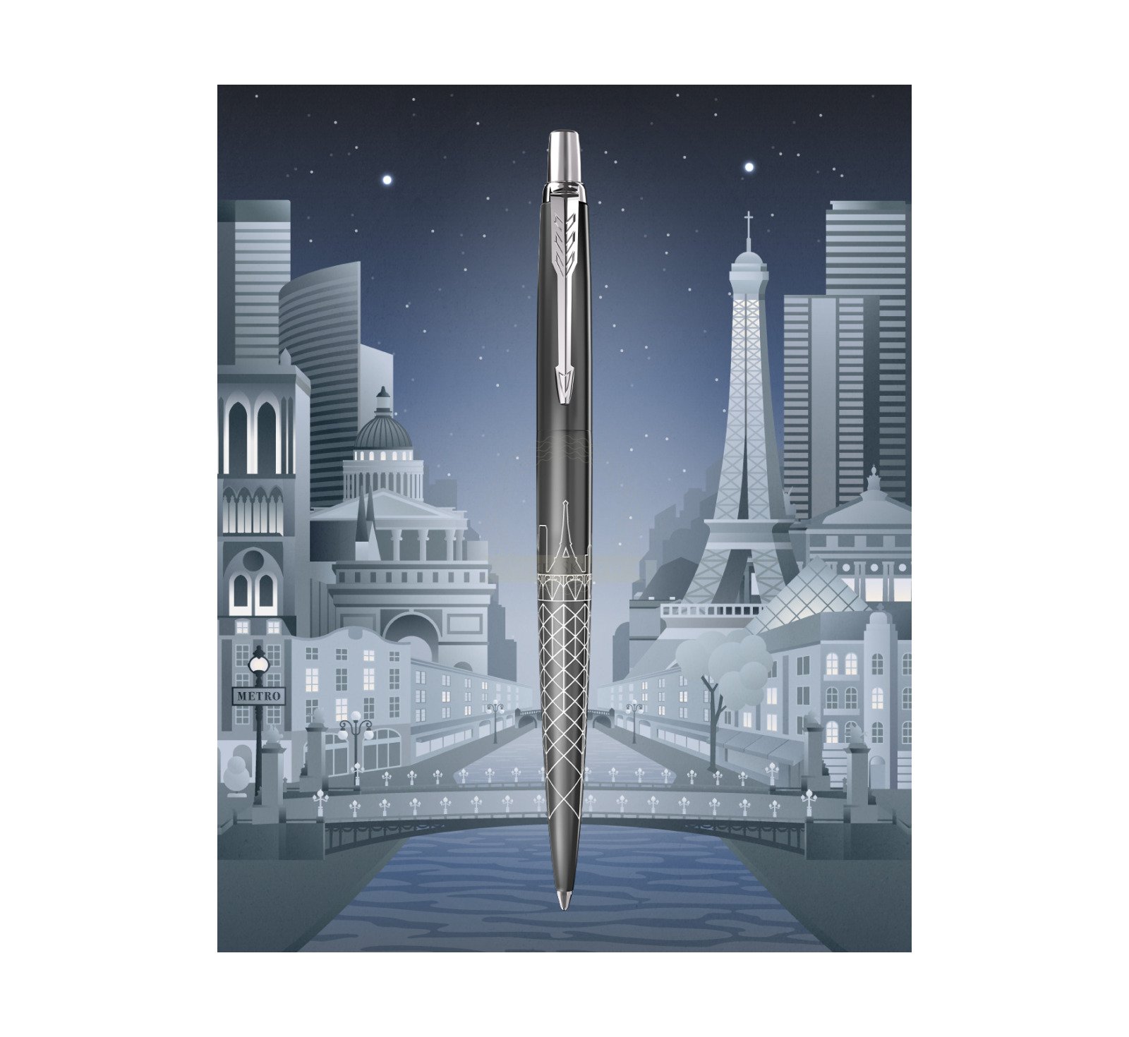 Jotter w edycji specjalnej kolekcji „Global Icons” to rezultat ostatniej, wielkiej wyprawy po metropoliach świata, która tym razem zawitała do czterech fascynujących destynacji. Za inspirację dla Jotter w edycji specjalnej Paris posłużyły zapierająca dech w piersiach panorama i urzekająca atmosfera Miasta Świateł. Ponadczasowe piękno eleganckich odcieni paryskiej architektury, misterne wzory zdobiące historyczne i współczesne pomniki znajdują odzwierciedlenie w poszczególnych elementach długopisu. To wyjątkowe wzornictwo zostało starannie naniesione laserem na korpusie tego wspaniałego artykułu piśmienniczego, będącego dowodem kunsztu rzemieślniczego Parker. Jego dopełnienie stanowią gładkie pismo i charakterystyczne kliknięcie długopisu Jotter wykończonego lakierem w kolorze szarości. Jotter w edycji specjalnej Paris zabierze osobę wkraczającą w świat luksusowego pisania w niezapomnianą podróż.
