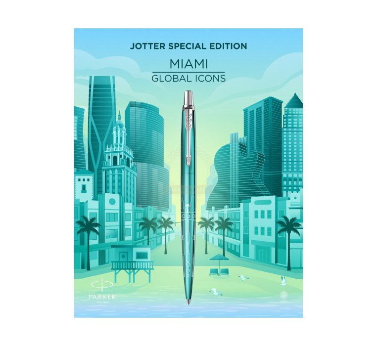 Jotter w edycji specjalnej kolekcji „Global Icons” to rezultat ostatniej, wielkiej wyprawy po metropoliach świata, która tym razem zawitała do czterech fascynujących destynacji. Za inspirację dla Jotter w edycji specjalnej Miami posłużyły wyraziste budynki w stylu Art Deco, śmiałe kształty geometryczne i kolorowy, figlarny styl Miami. Kultowe fasady Ocean Drive, charakterystyczne budowle i kapryśne detale nawiązujące do zabawnego, żywego ducha Miami zostały przeniesione na korpus długopisu. To wyjątkowe wzornictwo zostało starannie odzwierciedlone laserem na tym wspaniałym artykule piśmienniczym, stanowiąc dowód kunsztu rzemieślniczego Parker. Jego dopełnienie stanowią gładkie pismo i charakterystyczne kliknięcie długopisu Jotter wykończonego lakierem w kolorze turkusowym. Jotter w edycji specjalnej Miami to doskonały towarzysz dla wszystkich pisarzy spragnionych podróży.