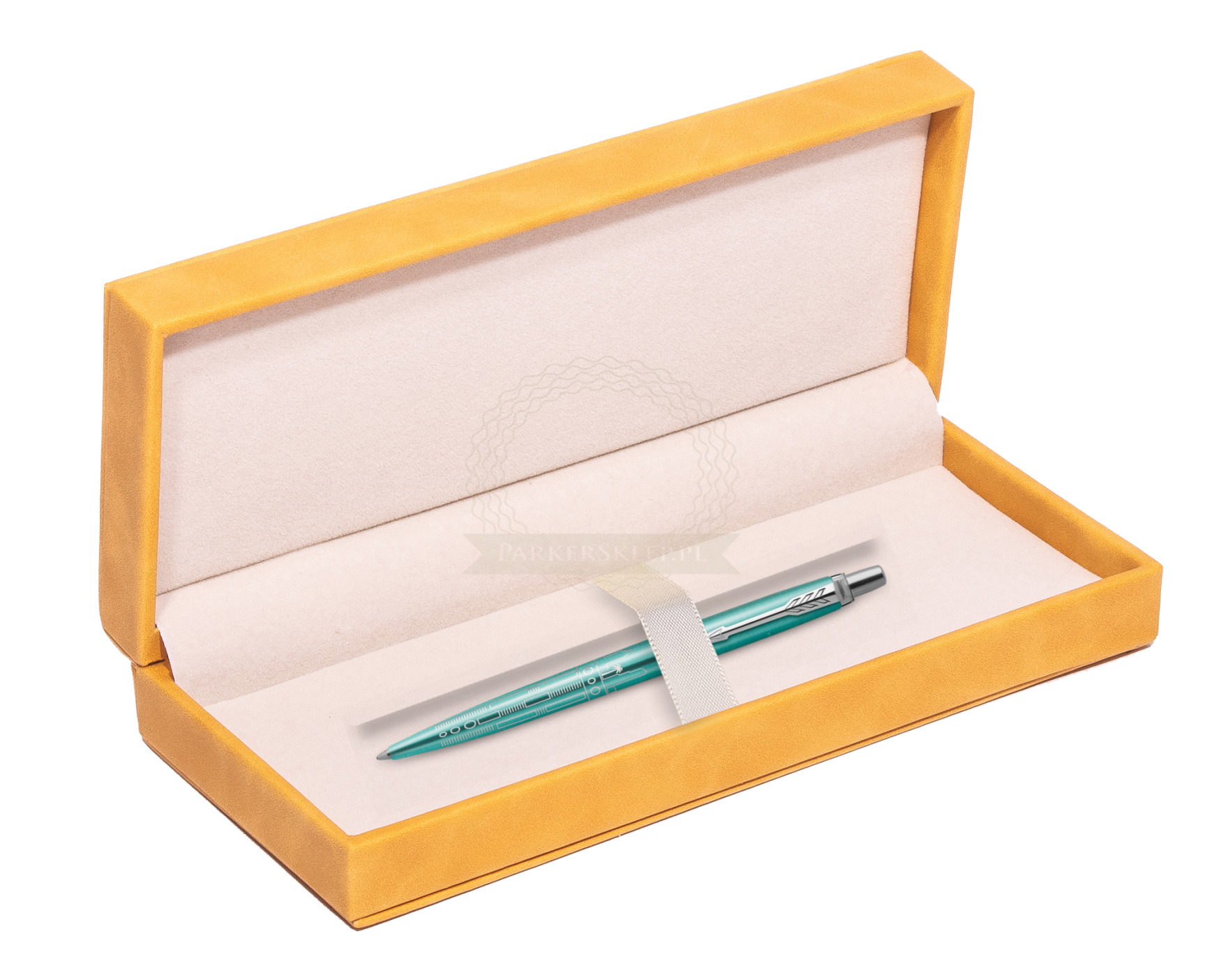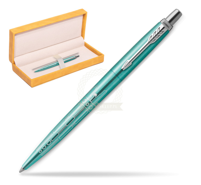 Jotter w edycji specjalnej kolekcji „Global Icons” to rezultat ostatniej, wielkiej wyprawy po metropoliach świata, która tym razem zawitała do czterech fascynujących destynacji. Za inspirację dla Jotter w edycji specjalnej Miami posłużyły wyraziste budynki w stylu Art Deco, śmiałe kształty geometryczne i kolorowy, figlarny styl Miami. Kultowe fasady Ocean Drive, charakterystyczne budowle i kapryśne detale nawiązujące do zabawnego, żywego ducha Miami zostały przeniesione na korpus długopisu. To wyjątkowe wzornictwo zostało starannie odzwierciedlone laserem na tym wspaniałym artykule piśmienniczym, stanowiąc dowód kunsztu rzemieślniczego Parker. Jego dopełnienie stanowią gładkie pismo i charakterystyczne kliknięcie długopisu Jotter wykończonego lakierem w kolorze turkusowym. Jotter w edycji specjalnej Miami to doskonały towarzysz dla wszystkich pisarzy spragnionych podróży.