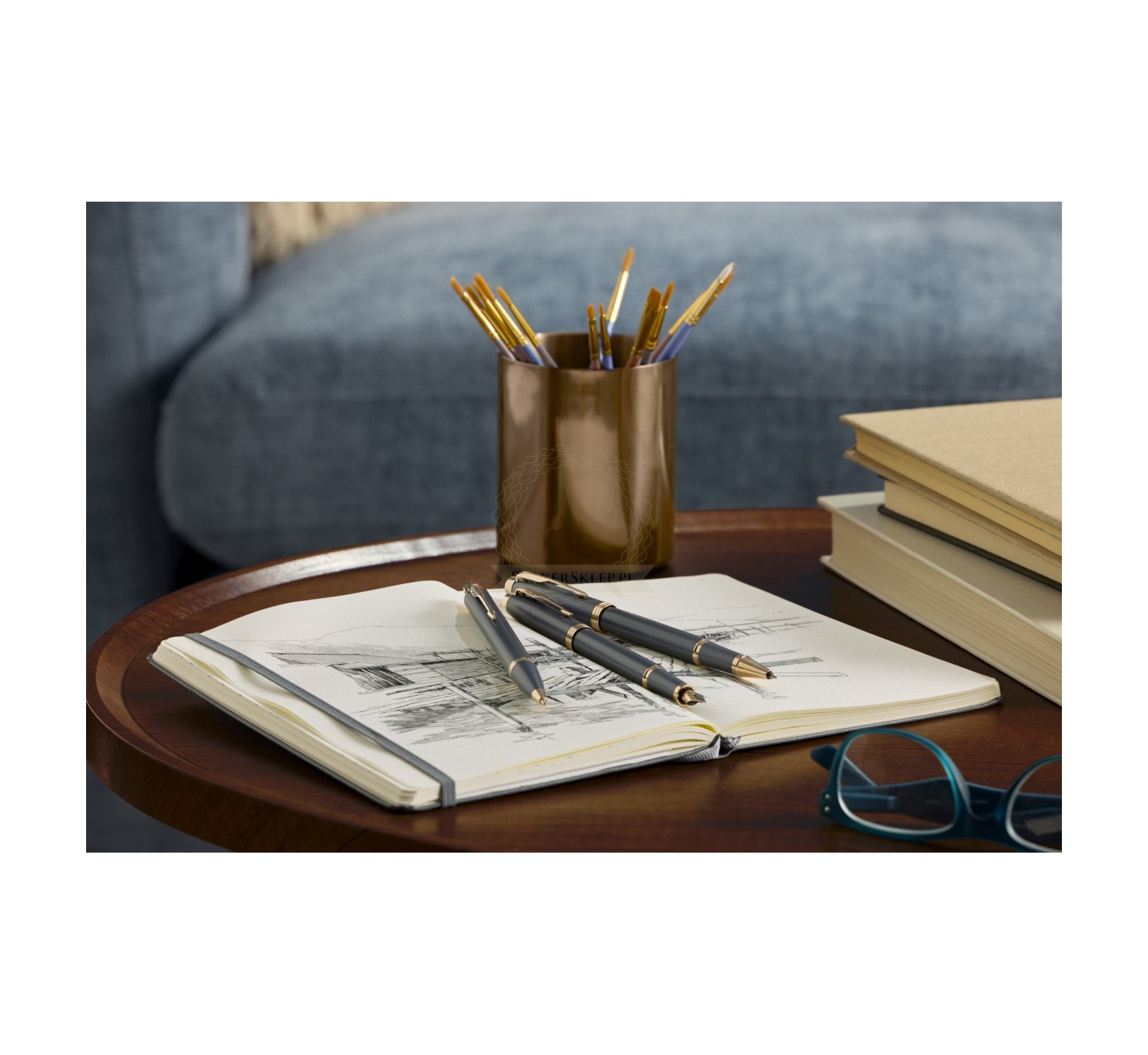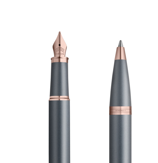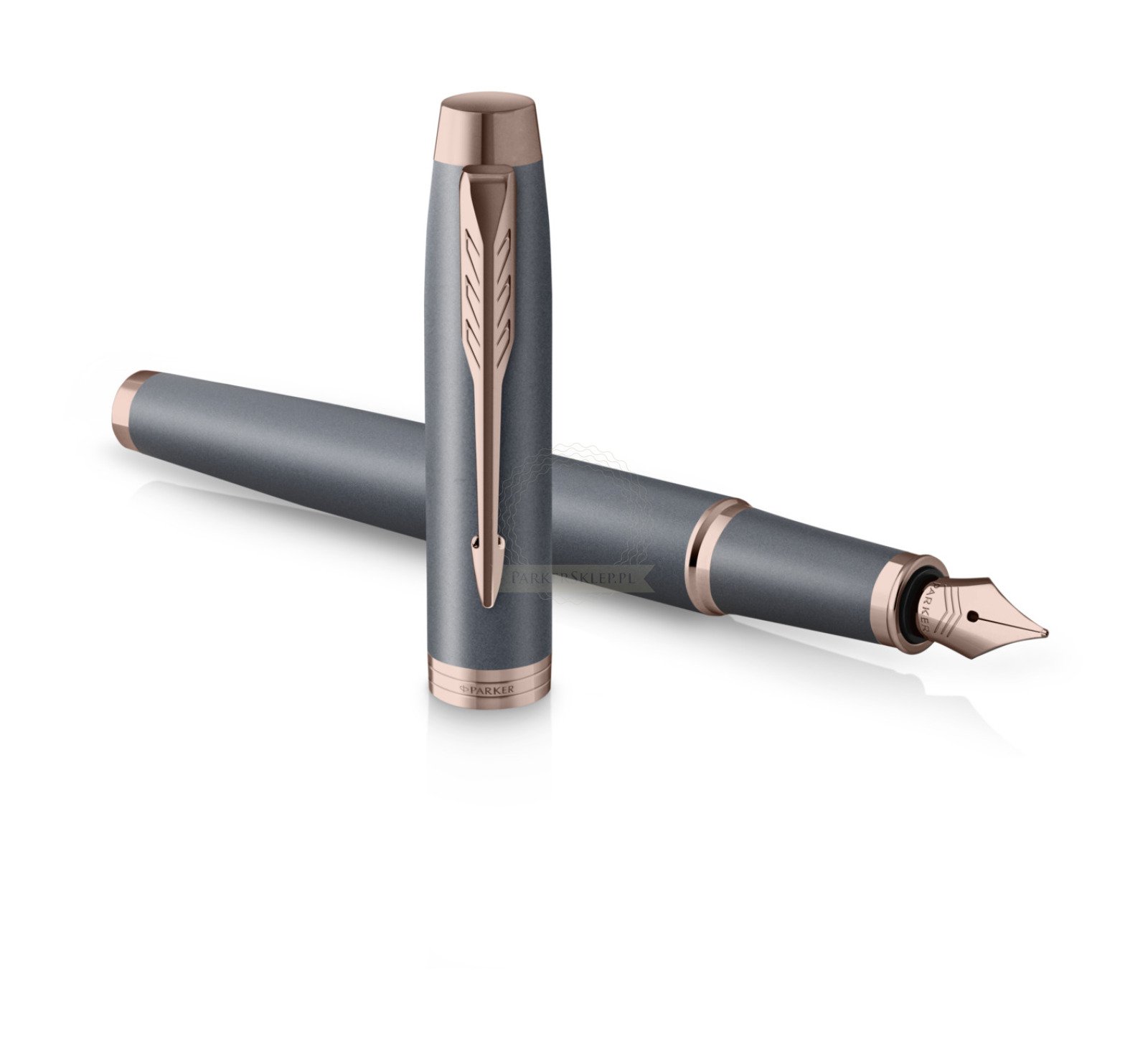 Wykorzystaj każdą chwilę inspiracji dzięki najnowszemu towarzyszowi Twojej podróży twórczej – kolekcji Parker IM Kropka nad i. Pióro premium zaprojektowane z myślą o osobach, które postrzegają pisanie jako najwyższą formę wyrazu. Dzięki niemu codzienne pisanie staje się wyjątkowym doświadczeniem. Idealnie sprawdza się do prowadzenia dziennika oraz zapisywania refleksji lub pomysłów. Każde jest dostępne w trzech nowoczesnych wykończeniach łączących delikatne satynowe odcienie z ciepłymi metalicznymi elementami, które zainspirują Twój wewnętrzny świat. Kolekcja oferuje możliwość personalizacji dzięki trzem opcjom pisma, z których każda zapewnia komfort, kontrolę i trwałość podczas długich, absorbujących sesji pisania. Są one dostarczane w eleganckim opakowaniu prezentowym – to inspirujący pomysł na prezent dla bliskiej osoby lub samego siebie. Głębokie szaroniebieskie wykończenie zostało zaakcentowane detalami w odcieniu różowego złota.