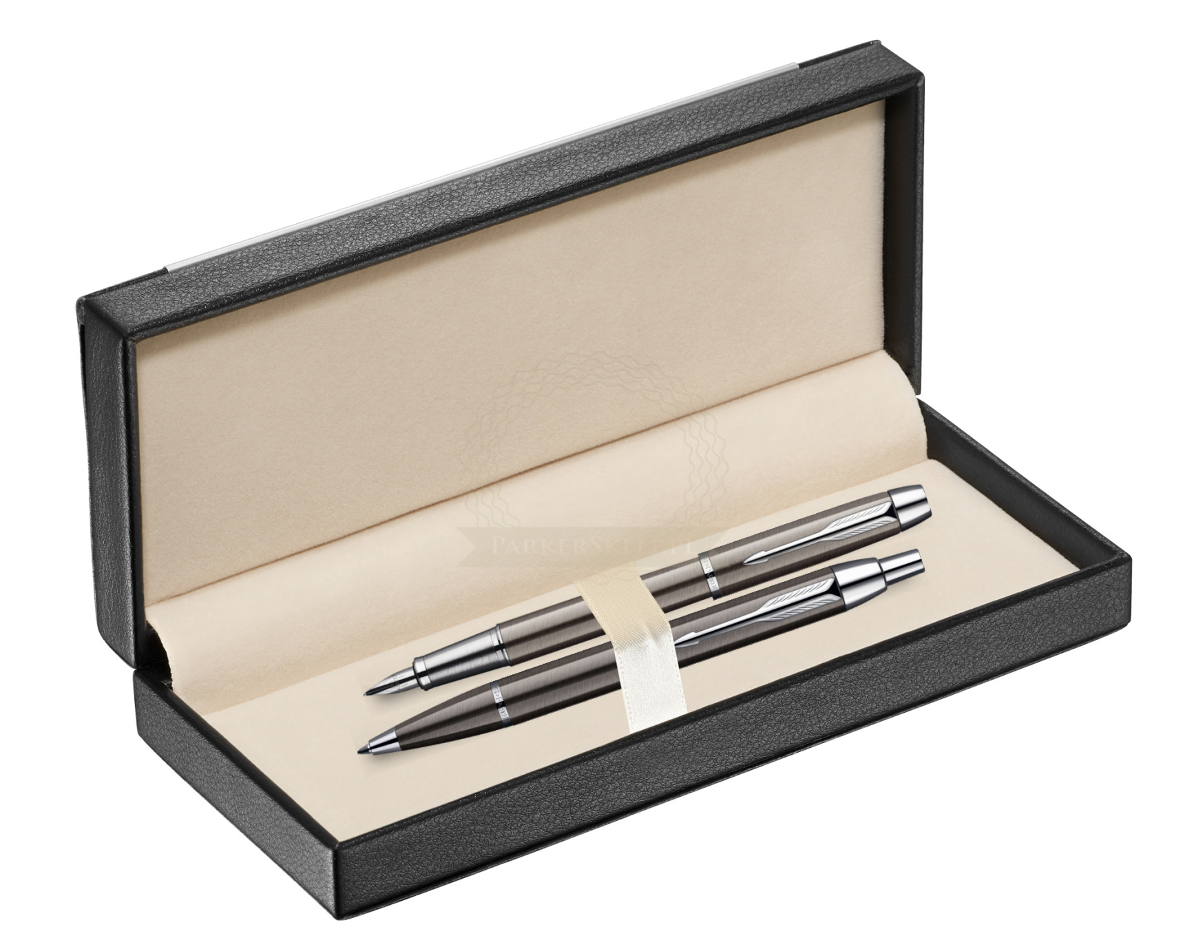 Zestaw prezentowy Parker pióro + długopis IM Gun Metal CT w brązowym pudełku zamszowym