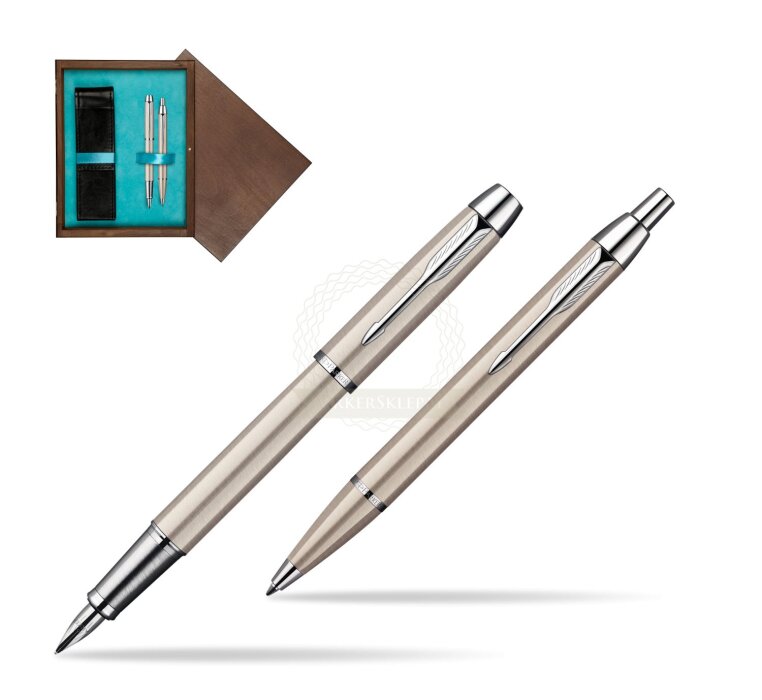 Zestaw prezentowy Parker pióro + długopis IM Brushed Metal CT w pudełku drewnianym Wenge Double Turkus (S0856220_S0856470_W2T)