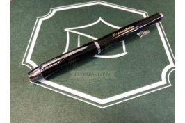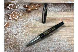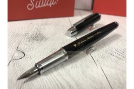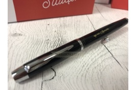 Mosiężny korpus ze szczotkowanego metalu pokryty laką w odcieniu głębokiej czerni. Wykończenia chromowane. Pióro wieczne wyposażone jest w stalówkę z wysokiej jakości stali typu M.