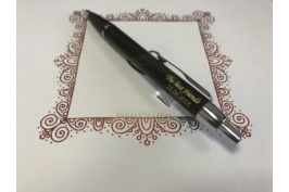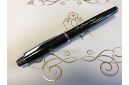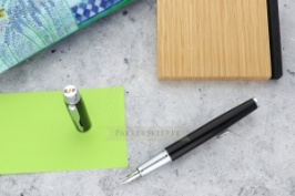 Mosiężny korpus ze szczotkowanego metalu pokryty laką w odcieniu głębokiej czerni. Wykończenia chromowane. Wyposażony w przyciskowy mechanizm wysuwania wkładu.
